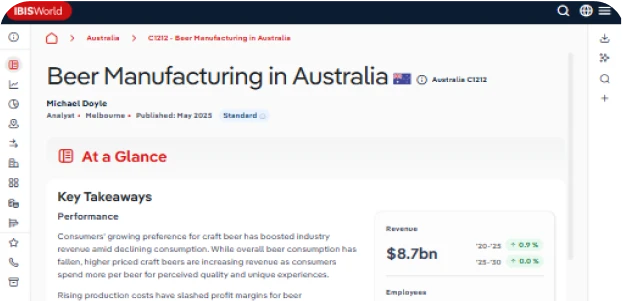 IBISWorld has been a leading provider of trusted industry research for over 50 years to the most successful companies worldwide. With offices in Australia, the United States, the United Kingdom, Germany and China, we are proud to have local teams of analysts that conduct research, data analysis and forecasting to produce data-driven industry reports.