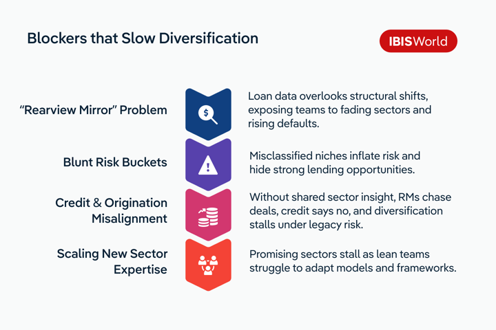 Even when a promising new sector is identified, the lift to train credit teams, rewrite models, and adapt risk frameworks is significant, especially for mid-sized banks with lean teams.