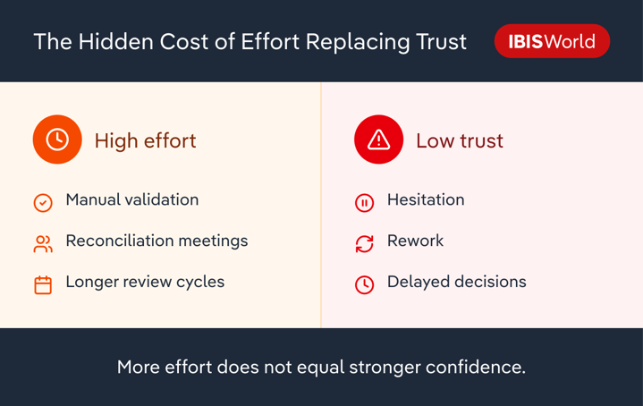 Teams spend more time validating inputs than interpreting outcomes. Meetings focus on reconciling numbers instead of understanding implications. Decision-makers receive polished outputs, yet hesitate — sensing that something underneath is less solid than it appears.