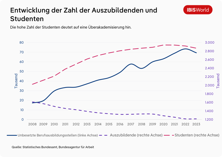 Gleichzeitig verändert sich das Ausbildungssystem. Immer mehr junge Menschen entscheiden sich für ein Studium, während die Zahl der Auszubildenden sinkt. Das hat zur Folge, dass besonders in handwerklichen und pflegerischen Berufen qualifizierter Nachwuchs fehlt. Zwischen 2008 und 2023 ging die Zahl der Auszubildenden um fast ein Viertel zurück, während die Zahl der Studenten um mehr als 40 % gestiegen ist.