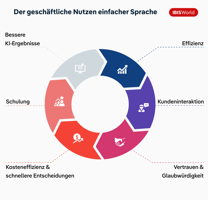Mit einfacher Sprache lassen sich Zeit und Kosten sparen. Sie trägt außerdem zu einem positiven Arbeitsumfeld bei und steigert die Produktivität sowie die Zufriedenheit der Mitarbeiter. Nicht zuletzt können sich Unternehmen durch klare Kommunikation von der Konkurrenz abheben, ob online oder im Ladenregal.