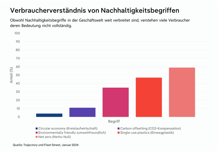 In einer gemeinsamen Studie untersuchten die britischen Unternehmen Fleet Street und Trajectory im Jahr 2024, wie viele Verbraucher einige der gängigen Begriffe aus der Unternehmenskommunikation zum Thema Nachhaltigkeit korrekt definieren können. Zwar konnten 59 % der Befragten mit dem geläufigen Begriff „net zero“ (Netto-Null) etwas anfangen, dennoch blieb für viele unklar, worum es im Kern eigentlich geht. Bei Begriffen, die vor allem in der Unternehmenskommunikation verwendet werden, wie „carbon offsetting“ (CO2-Kompensation), sank das Verständnis erheblich. In diesem Fall wussten nur 11 % der Befragten, was damit gemeint ist.