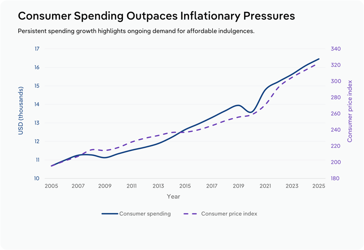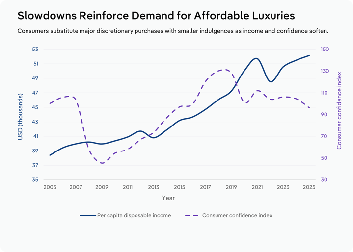 As a result, businesses manufacturing and retailing these affordable luxuries are well-positioned to bolster performance, with economic uncertainty expected to linger into the coming years. These businesses can focus on retailing goods that are highly profitable and benefit from having greater perceived value among customers. For many of these businesses, what is lost in the lower average transaction sizes is surpassed by the number of units they can sell, compared with larger luxury purchases like automobiles. These business models provide much greater revenue stability than other luxury industries; revenue also remains high when consumer confidence rises and consumers have more disposable income again to allocate to treats and small luxuries.