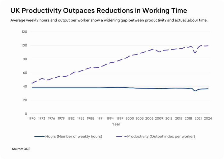 This has happened in the past. During the three decades following World War II, strong collective bargaining and tighter labour market regulation led to a steady drop in the average full-time workweek in the UK, from 46 hours in 1946 to just under 40 hours in 1979. The UK would have been on target to reach a 30-hour week (equivalent to a 4-day week) by 2040, had hours continued to fall in line with the initial post-war trend. However, from 1980, this trend faltered with the deregulation of the labour market, resulting in a dip of just 1.3 hours to 36.7 hours in 2024.