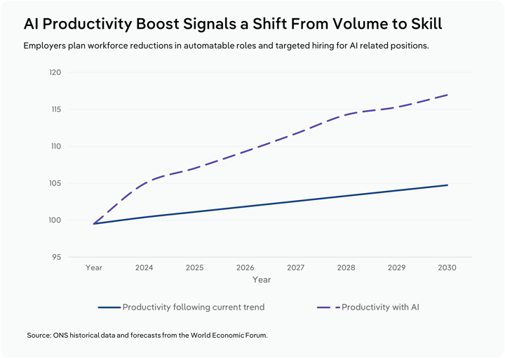 Largely in line with these productivity expectations, 40% of the largest global employers plan to reduce their workforce where AI can automate tasks by 2030. Three-quarters of these employers also plan to hire for new AI-related jobs during the same period, but they expect their wage costs to remain largely unchanged. This suggests that many lower-skill jobs are set to be replaced by fewer, higher-skill jobs.
