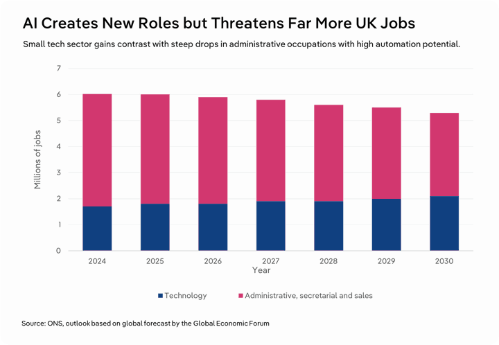 While some AI-driven jobs are expected to nearly double over the next five years, the UK tech sector employs only 1.7 million people, which is approximately 7.9% of all jobs in the UK. Approximately 20% of Britons are employed in administrative and secretarial occupations and sales and customer services, which are among the fastest-declining jobs as a result of AI and automation. In addition, 25.7% of people are employed in professional occupations, which are mainly knowledge-work-based but could also be automated (to some degree) in the coming years.