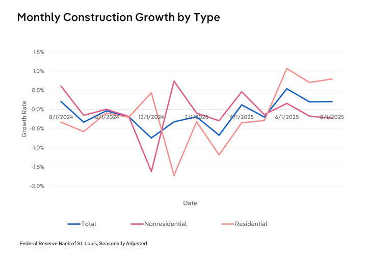 The economy expanded at an annualized rate of 4.3% in Q3 2025, driven by resilient consumer spending that grew despite tariff-inclusive pricing and inflation, demonstrating the economy's initial resilience to the implementation of tariffs. However, underlying dynamics reveal diverging sector performance, with consumer spending strength contrasting sharply against labor market weakness as job creation slowed dramatically compared to the prior quarter. Employers reduced hiring and increased layoffs to restructure operations and control costs, leading to a 4.4% rise in unemployment, which created headwinds for household income growth and future spending sustainability. Inflation remains elevated at 2.8% year-over-year, above the Federal Reserve's 2.0% target, driven primarily by rising electricity and food costs, constraining real wage growth despite nominal wage increases. The Federal Reserve responded to deteriorating labor market conditions by cutting rates 25 basis points in September, easing borrowing costs and supporting mortgage and consumer financing activity. Meanwhile, select nonresidential construction segments, particularly data centers benefiting from investments in artificial intelligence, provided additional growth support during the quarter. This mixed performance—characterized by strong consumption offset by labor weakness and persistent inflation—reflects an economy navigating the impacts of tariffs and policy uncertainty while maintaining modest forward momentum.