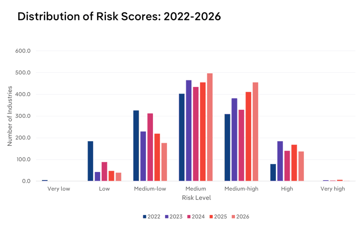 - The implementation of tariffs created new economic headwinds in 2025. While selective trade pauses and negotiated deals offered partial mitigation, uncertainty persisted around rising input costs and weakening trade growth. Consumer demand has become increasingly price-sensitive, constraining operators' ability to pass tariff-driven cost increases to customers without risking volume losses. This pricing pressure and reduced consumer spending appetite elevated risk exposure, with 44.8% of industries classified as medium-high risk or higher.