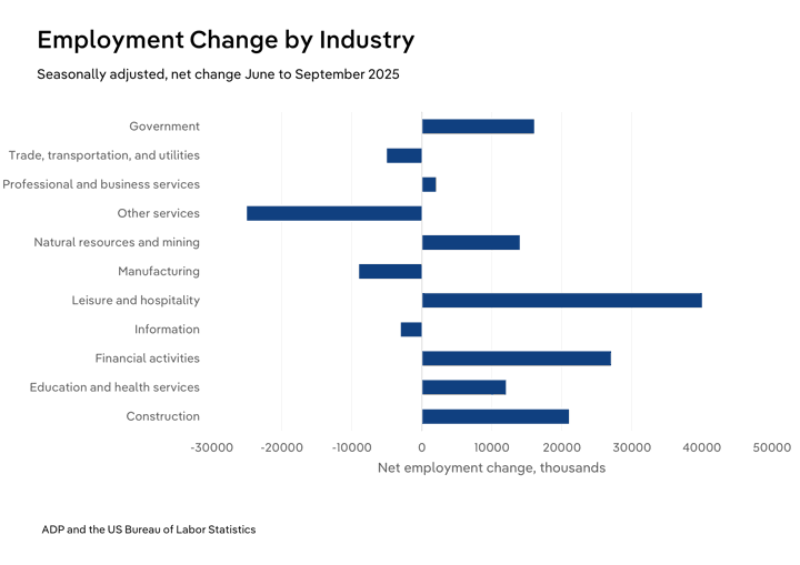 - Private sector employment gains slowed considerably in Q3 2025, adding only 72,000 jobs from June to September—a 0.1% increase. While this represents continued growth, the modest pace signals a tightening labor market with diminishing momentum in job creation.