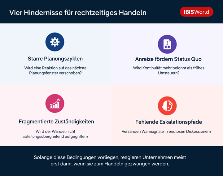 • Verspätete Reaktionen sind meist das Ergebnis starrer Planungszyklen, ungeeigneter Anreizsysteme und Lücken in der bereichsübergreifenden Verantwortung, nicht fehlenden Wissens.