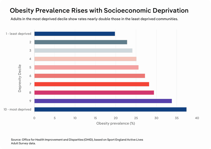 Poorer areas of the UK are also the least physically active, with the most deprived decile recording a 35.3% physical inactivity rate according to the OHID. Limited access to affordable, safe spaces for exercise makes it harder to be active, contributing to higher rates of obesity in deprived communities.Consumer confidence has remained weak through 2025-26 as inflation has stayed above the Bank of England’s 2% target and a rising tax burden has constrained growth in real household disposable income, keeping the GfK consumer confidence index in negative territory in January 2026. As household budgets remain tight, many people are likely to cut back on discretionary spending and focus on essentials, which will put costly weight-loss drugs out of reach for a large share of the population. By contrast, more affluent Brits will still be able to afford these treatments, meaning obesity rates and related risks like cardiovascular disease and Type 2 diabetes will fall fastest in this already advantaged group, widening health inequalities.