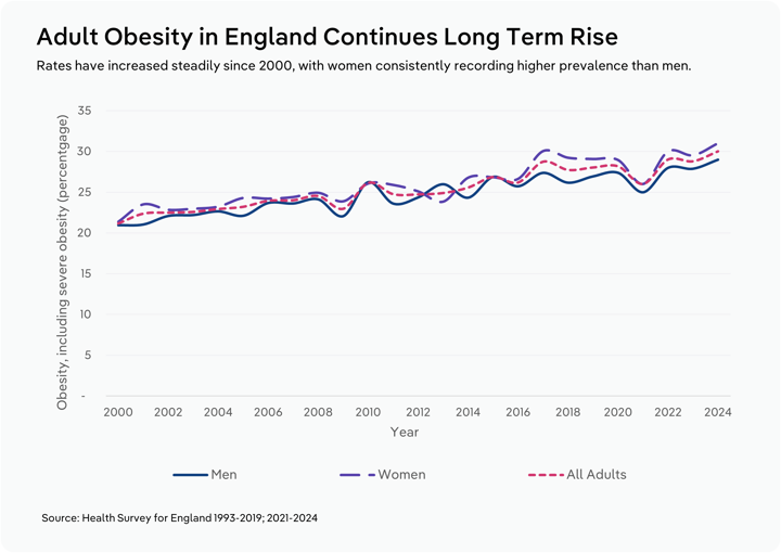 The World Health Organisation defines obesity in adults as a Body Mass Index (BMI) greater than or equal to 30. Hybrid working environments are encouraging more sedentary lifestyles among many Brits, contributing to rising obesity rates. The Health Survey for England found that 30% of adults were living with obesity in 2024. This marks an increase from the approximately 25% of adults reported as obese in 2014.