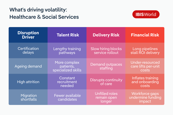 • In healthcare, structural staff shortages are limiting service expansion as training bottlenecks, turnover and credential needs slow rollout.