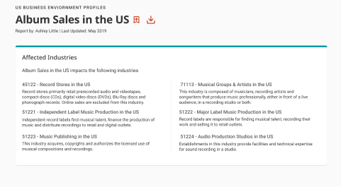 Business Environment Profiles are linked to relevant industries in IBISWorld’s database. This connection lets you see how external drivers influence specific sectors. By combining profiles with industry reports, you gain a complete 360° view of performance drivers.