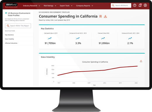 IBISWorld's Business Environment Profiles are datasets and analytical snapshots of key external drivers, such as macroeconomic, demographic, or governmental indicators, that affect industry performance. They allow you to identify risks before they impact your business by offering forward-looking trends that inform smarter decisions.