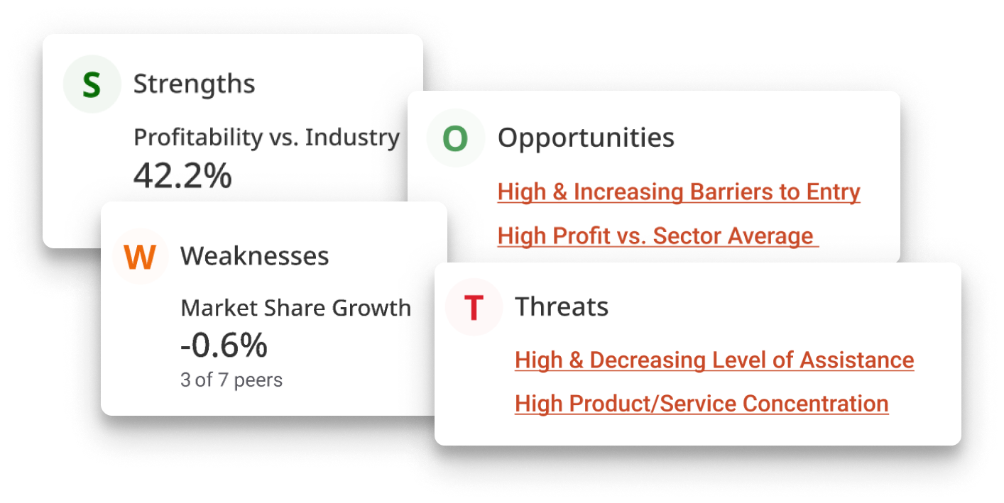 • Identify cross-selling opportunities through quick insights from SWOT analyses - available for over 5,000 companies across the US market